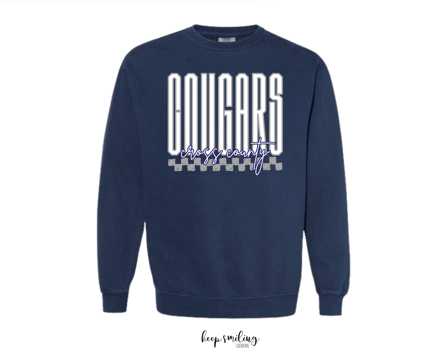 Cross County on a Comfort Colors garment-dyed soft ring spun crewneck sweatshirt. 80/20 ring spun cotton/polyester. The color has a washed look, giving it a fun vintage look and feel. Unisex and runs true to size. Color is Team Navy.