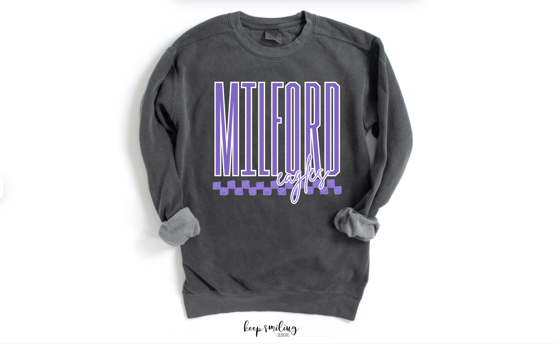 Milford on a Comfort Colors garment-dyed soft ring spun crewneck sweatshirt. 80/20 ring spun cotton/polyester. The color has a washed look, giving it a fun vintage look and feel. Unisex and runs true to size. Color is Pepper.
