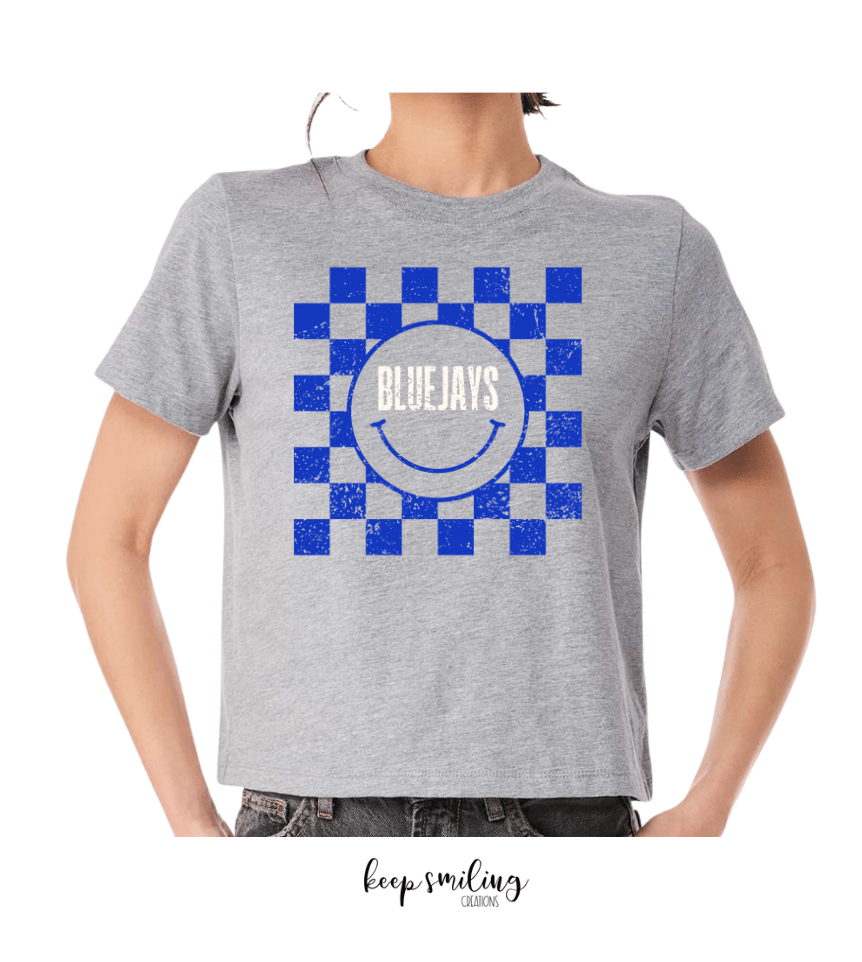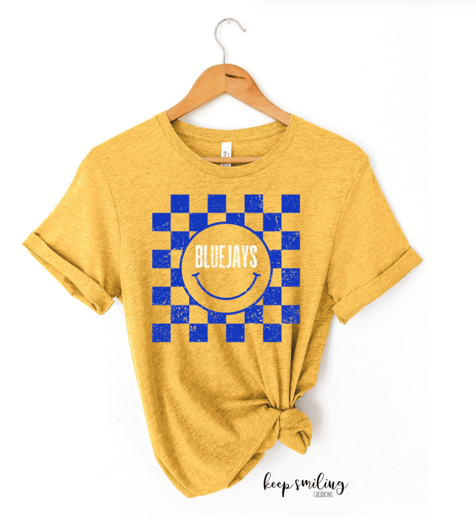 Smiley checkered Bluejays tee in a couple different options!