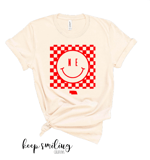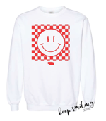 Smiley design available in t-shirts and crewnecks! Come in white or cream!
